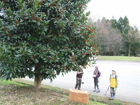 美女平を出て間もなく、みなさん見覚えのある写真の樹のところで、道路に車が何台も駐車 、消化器が道路にいくつも整列 ・くだんの樹に梯子、大勢の人が何やら、、、、。