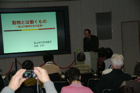 富山県自然保護課の赤座副主幹は富山の動物の年代による変遷を、豊富なデータを元に解説されました。 |
